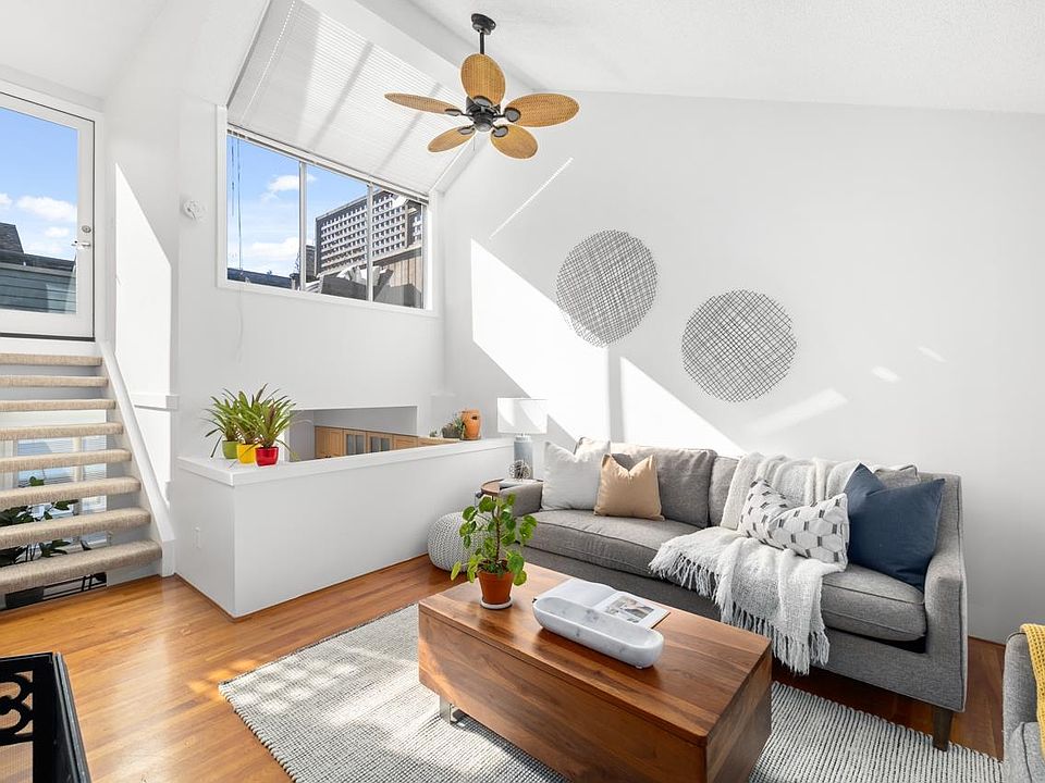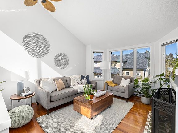 Fantastic NORTH OF 4TH Kitsilano TOWNHOUSE. Awesome LOCATION steps to Kits beach, pool, tennis, shops & cafes. Private courtyard front door entry, very quiet, split level with great separation of bedrooms from upper living area. Bright & airy with front & back light exposure, multi skylights, soaring 12ft vaulted ceilings in living room with N. Shore mnt. views & wood fireplace. Spacious dining room to kitchen, plenty of counter, cabinets & stainless steel appls. Beautiful bathrooms feature lux radiant heated floors. Garden & relax on the sunny south ROOF TOP DECK & lower PATIO. This home feels BIG. Loads of storage in the easy access crawlspace & large locker. Includes 2 parking stalls. Pets, rental ok. Excellent strata. Don't miss this one!