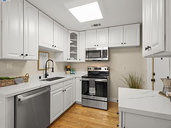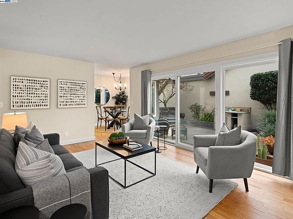 Location, Location, Location! This beautifully updated 3 bedroom, 2 bathroom townhome is located near quaint Downtown Pleasanton. End unit offers much privacy and access to walking trails. Property improvements include but not limited to new interior paint, carpet, fixtures throughout, bathroom updates, kitchen counter & appliances plus refinished hardwood flooring. Primary bedroom & bath plus ample storage and walk-in closet located upstairs. Two bedrooms plus bath located on first floor. Spacious bright living space with hardwood flooring, slider to private courtyard with built-in BBQ to enjoy with family and friends. No common wall space shared; only garage and patio wall are shared. Attached two car garage and large attic space for extra storage upstairs. Walk to downtown and top rated schools. Minutes from ACE train & 680. HOA includes water/sewer, community pool and clubhouse, green space, exterior maintenance, hazard insurance as well as RV/Boat storage. HOA currently re-landscaping community. A lovely mature community and a must see!