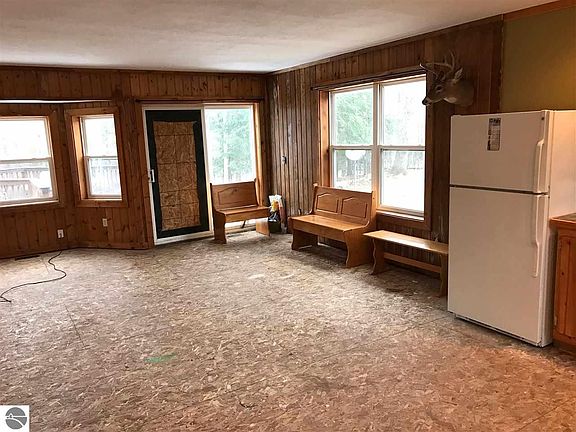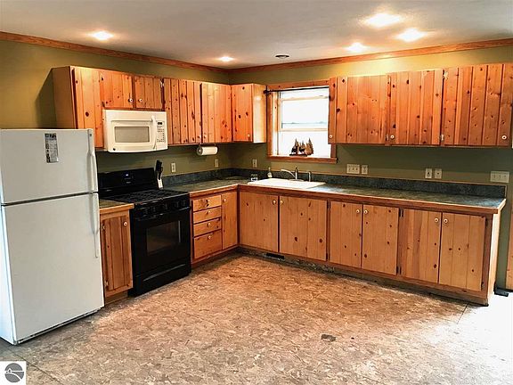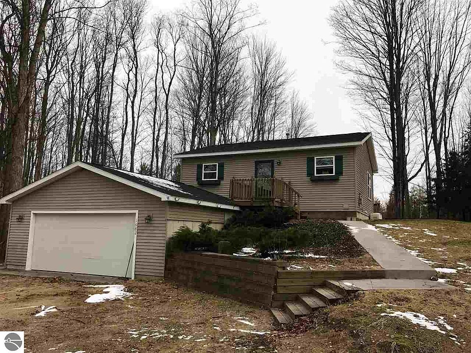 Raised ranch on a beautifully wooded 10 acre site in Kingsley. Knotty pine in the LR with an open kitchen and new countertops. Main floor bath has ceramic tile floor and new vanity. 2 car garage with a barn for chickens/pig/goats...this is a child's paradise. Jackson Creek is toward the back of the property. Exterior wood furnace plus LP gas for back up.