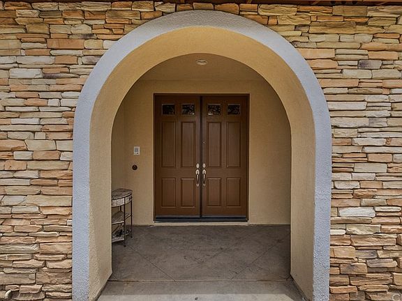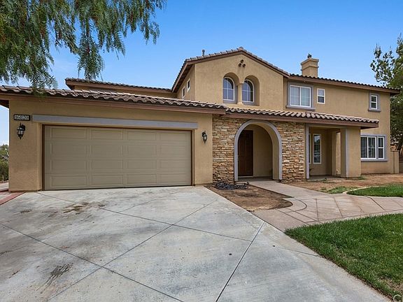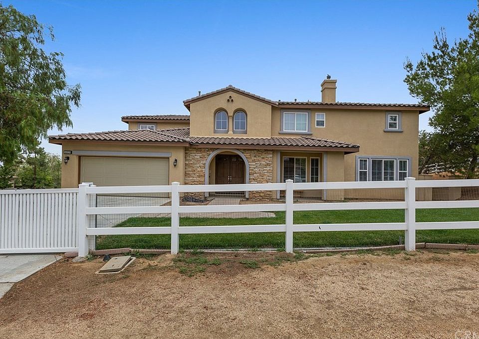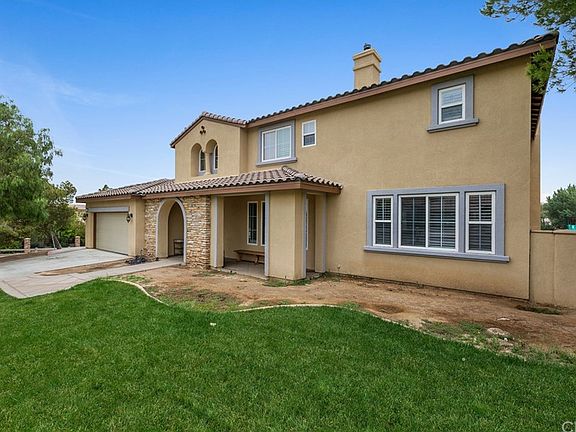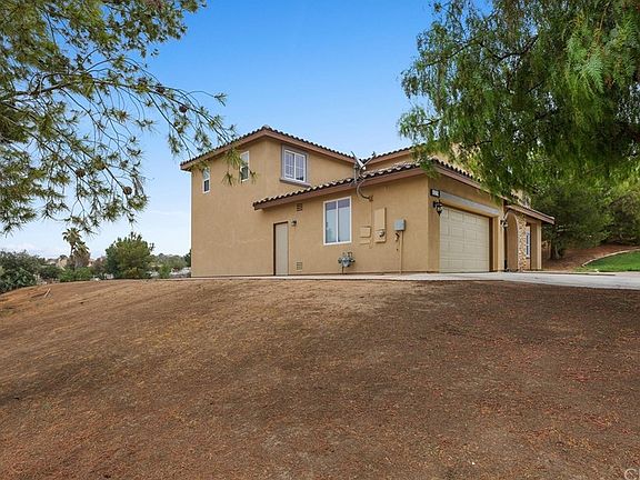 This impressive Bridle Creek home in the beautiful Mockingbird Canyon area of Riverside is dressed up with stacked stones, a lush green yard and sits on a cul-de-sac street. Enter through the double doors and you will see the regal 2 story foyer that looks up the stairway accented by freshly refinished railings and new metal rails with the scroll design. This home also offers an open floor plan with a massive loft upstairs where your family will spend much of their time. The large open kitchen has granite counters, a breakfast bar, pendant lights, espresso colored cupboards, dual ovens, a desk/coffee station, and a walk-in pantry. There is a formal dining room with trey ceilings, and an office/den that shared a dual sided fireplace with the formal living room. Crown moldings and plantation shutters are throughout this home. The 1+ acre property is fully fenced and provides a split level lot. Use the upper level for your pool, and let horses enjoy the lower level. Since this is on a corner lot, you have gate access to the lower level from the corner street.