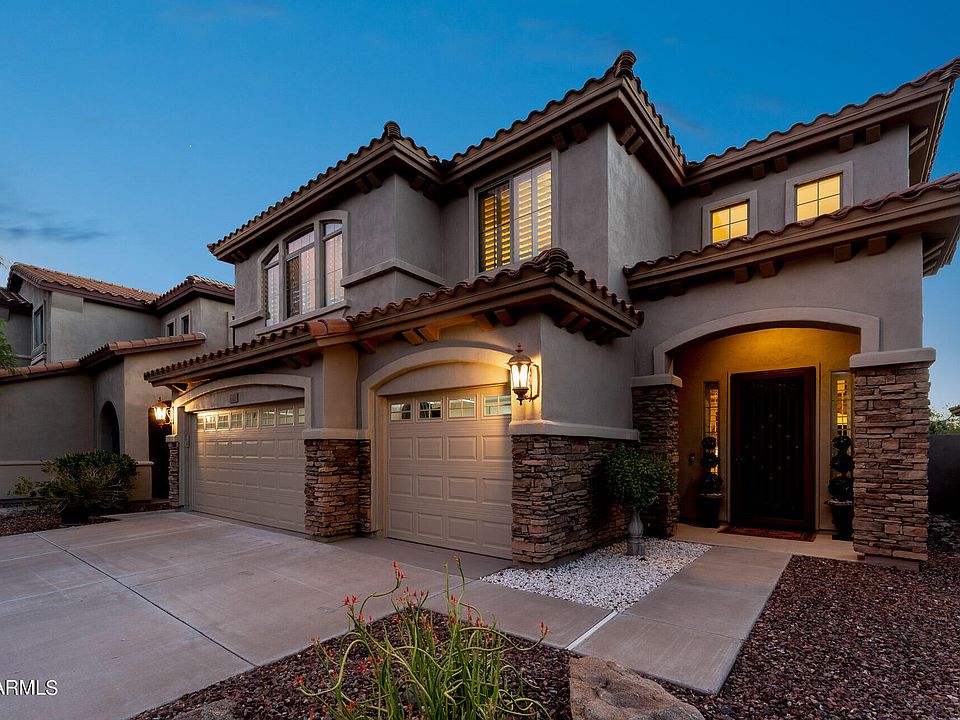 Come view this Gorgeous home with exterior and interior custom Stonework. The grand entry area has soaring 20-foot ceilings with a beautiful Juliette loft balcony. The Kitchen is complete with new appliances, under cabinet lights, lots of cabinet space, large island, built in oven and a gorgeous wine storage room with custom iron door. Home also has new water heater, washer, dryer, all new carpet and the Master Bathroom has just been remodeled. Fresh paint on the walls, back patio floors , garage floor, Central Vac, Wood Shutters, wired surround sound and Panoramic Mountain Views . All bedrooms are upstairs but the lower level does have an office den that can be a bedroom since its next to a full bath. Walking Distance to Notre Dame High SCHOOL.
