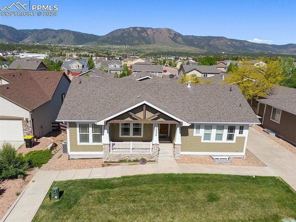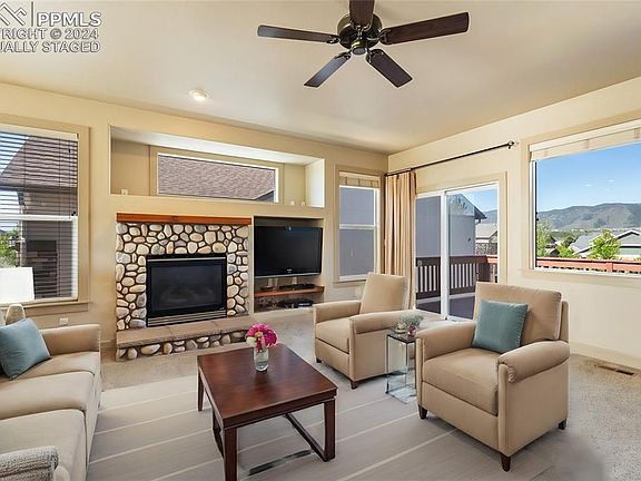 This well-maintained ranch-style home features a private fenced yard for your 4 legged friends, 4 bedrooms, 3 bathrooms, an attached 2-car garage, and 3,008 square feet of living space. Designed for main-level living, this highly sought-after home includes a living room, dining room, kitchen, master bedroom, an additional bedroom, 2 full baths, and laundry facilities on the main floor. The kitchen is a chef’s delight, boasting extensive hardwood flooring, 42-inch maple cabinetry, upgraded stainless steel appliances, Corian countertops, an eating nook, a pantry, and a walkout to the front porch. Relax in the living room by the stone-accented gas fireplace, or step out onto the deck to take in breathtaking views of Pikes Peak. The spacious primary bedroom offers a quiet retreat with a walk-in closet and an adjoining 5 piece bath for ultimate tranquility. The fully finished walkout basement provides even more living space, including 2 additional big bedrooms, an office, a full bathroom, and a family room with built-ins, upgraded lighting, French doors, and a walkout to a beautiful, private fenced yard. Enjoy the convenience of nearby schools, shopping, and quick access to I-25. This home is within walking distance of Monument restaurants and the farmer's market and across the street from the neighborhood park and the Santa Fe Trail that stretches from Palmer Lake to Colorado Springs. The HOA covers all the outside maintenance of the structure (except the deck), management, yard work, fencing, maintenance of the common grounds and picnic areas, and snow and trash removal. You will enjoy your dream home in the prestigious Village at Monument, just 20 minutes from Colorado Springs and an easy commute to Denver. It offers the perfect blend of serene mountain views and suburban convenience. Enjoy Colorado living at its finest.