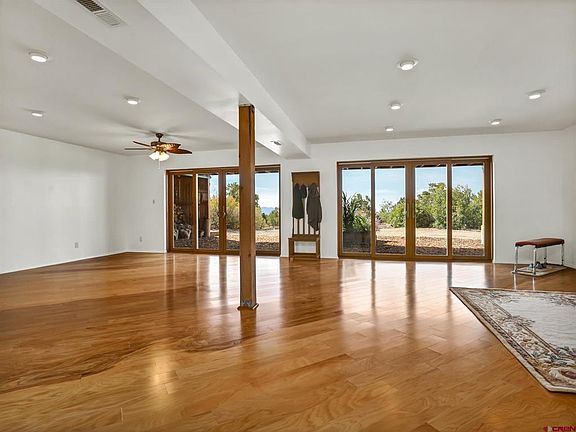 Breathtaking sunsets, views of the San Juans, Mesa Verde, the Sleeping Ute, and the Blues! This well maintained energy efficient 3br. 3 bath home sits at the top of a knoll overlooking the entire Cortez Basin and more. Upon entering the home you walk into an open airy space that includes the living room and the kitchen. Off the main floor are two sliding glass doors that open up to a massive covered deck that wraps around three sides of the home making it a great place to watch the sunset and take in the sparkling lights of Cortez. Upstairs are two bedrooms with doors that open up to the deck off the master suite. Downstairs an additional living space has been created with hickory floors and a third bedroom. There's a wood stove upstairs and a custom built fireplace/cooking hearth downstairs. Also, downstairs has an extra room that's been wired for a sauna. Outside on the north end of the home a 120 volt electrical hookup for an RV is in place. On just under 18 acres of rolling forested terrain you get the privacy you want but also the convenience of being close to Cortez and Dolores. Schedule a showing today!!