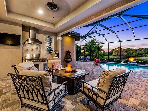This stunning custom home sits on a spectacular, one of a kind, private cul-de-sac lot with striking water views surrounded by a serene preserve. Rich with architectural details and exquisite finishes including tray ceilings & moldings, custom light fixtures & window treatments, this jewel box home is further enhanced with a fabulous open layout. The gourmet kitchen is fitted with every appliance a chef desires with 5 burner gas cooktop and hood, built-in double ovens, hidden pantry and gorgeous wood cabinetry. A large center island with seating unites with the dining area and gathering room with disappearing sliders that blend seamlessly to the covered lanai. The spacious master wing offers sitting area with bay windows, 3 walk-in closets with custom cabinetry as well as a spa-like master bath. There are 2 additional guest suites and baths as well as an office/den. Surrounded by outdoor lighting, the lanai is a private oasis and is the perfect space for easy living or elegant entertaining featuring an inviting salt water pool with gas fire bowl/waterfall, 2 large covered areas and a well-appointed summer kitchen. Additional upgrades include impact windows and doors, porcelain tile throughout living areas and 3 car garage. Country Club East provides residents with the privacy of gated community living with 3 community pools, fitness center & the benefits of easy accessibility to excellent shopping, dining, medical facilities & I-75, for an unparalleled lifestyle defined by relaxation & recreation.