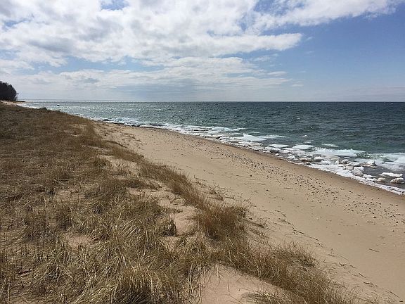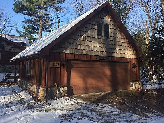 The home is one of the area's classic "Bliss built" lake stone foundation log homes in the Good Hart area. There are two opposing, totally separate, Lake Michigan stone "heatilator" fireplaces sharing a single Lake Stone structure, one in the living room and the other facing the dining/kitchen area. The “cabin” has a full length vaulted natural wood and exposed log beam ceiling extending into the bedroom loft area over the kitchen. The view out the generously windowed western side of the "cabin" is of Lake Michigan. The large detached 2 1/2 car garage has a workshop area, the 2nd full bath and a laundry/utility area on the main floor. There is a full attic that includes a windowed and heated second floor office. This attic space has the potential to be finished into a studio or a bunk-room for visiting family members and/or guests. The lake side of the cabin has a spacious deck overlooking the winding path leading to the Lake Michigan beach, only steps away.