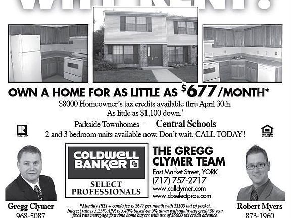 Listing agent: Gregg Clymer, Call 717-751-1255 for information. Great Starter Home! Mortgage Payment less than rent. Act now! First time homebuyers are eligible for $8000 which expires 11/30/09. Unit includes all appliances, plus washer & dryer! Close to -parks, shopping & highways.