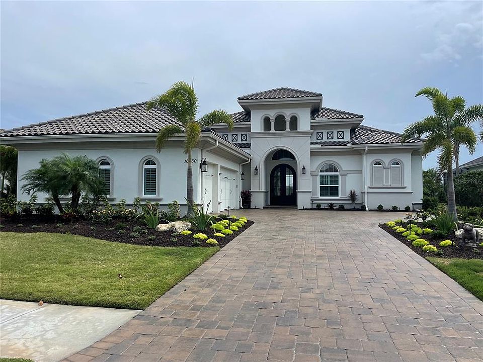 Stunning View and NO CDD! Welcome to your own piece of paradise! This beautiful custom-built home is located on a premier lake view lot in The Lake Club. Home includes an EXTENDED 4’ garage and an EXTENDED covered lanai (only a few were lucky in the Lake Club to have this option/ no longer available by builder). Enter this wonderful, open floor plan through the 10-foot custom arch wrought-iron double doors that open to the foyer and great room with ultra-high ceilings, custom wall detail including floating shelves, crown molding, and 7-1/2 base boards throughout. The kitchen, located between the great room and dining room it boasts custom cabinets, quartz countertops, stainless steel KitchenAid appliances, a coffee bar with a beverage refrigerator, oversized island, and a large pantry. Retreat to the Master Suite while you enjoy a custom fireplace, mantle, and private access to the lanai. The master suite includes a large walk-in shower, self-standing bathtub, two large vanities and two custom-organized closets. Two en-suite bedrooms, with a bonus room en-suite that can easily be transformed into a fourth bedroom if desired by adding a closet. The sellers spared no expense on the outside living space beginning with an EXTENDED lanai, a stone kitchen with Coyote Appliances, a 110” theater screen and projector. The custom designed saltwater pool is capable of not only heating, but also cooling the water during those hot summer days. Pool includes a sun shelf, water features and a soothing spa. Plantation Shutters and motorized blinds cover the Hurricane impact glass windows and doors throughout. Enjoy constant hot water via tankless equipment and newly installed Water softener system. Completely redesigned landscaping in February 2023. The Lake Club is a private gated community featuring a Grande clubhouse, two-resort style swimming pools, an expanded fitness center and lifestyle center. Tennis, pickleball, playground, basketball, Linear Park, kayaking and fishing. Professional photos to follow.