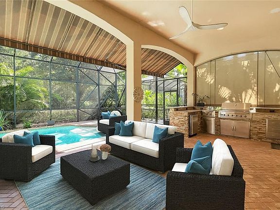 Timeless architecture meets modern luxury and refined elegance in the prestigious, gated community of Mediterra, This beautifully designed residence greets you with a glass-paneled French door entry opening to a grand foyer, setting the tone for sophisticated living. The expansive living room showcases oversized crown molding and a dramatic tray ceiling, creating an atmosphere of understated opulence. A generous formal dining room flows seamlessly into a stylish wet bar featuring a wine refrigerator—perfect for effortless entertaining. The gourmet kitchen impresses with a two-tier breakfast bar, abundant cabinetry, and ideal connectivity to the sprawling family room. Walls of sliding glass doors open fully to a screened and covered lanai that embodies resort-style living, complete with an outdoor kitchen, bar, pool, and spa—perfect for year-round alfresco gatherings. A newly fenced private backyard offers tranquil privacy and space for relaxing. The luxurious primary suite is a true retreat, featuring private access to the lanai, dual walk-in closets, and a spa-inspired bathroom with dual vanities, a soaking tub, and a large walk-in shower. Two additional oversized guest suites, each with their own ensuite baths, offer comfort and privacy for family or visitors. A tasteful powder room serves guests, while the well-appointed laundry room includes a sink and ample storage. Additional highlights include two separate garages, solid core interior doors, and the convenience of natural gas—all in a meticulously maintained, amenity-rich community known for world-class golf, tennis, fine dining, and private beach club access. This is Mediterra living at its finest.