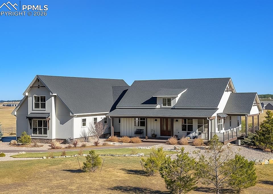 Bring your horses or alpaca! This stunning custom home has a large WALKOUT basement and sits on 20 acres across from 1,600 acres of protected wildlife and nature conservation land. Featured in the 2019 Parade of Homes, this exceptional residence was designed with multi-generational living in mind and offers over 6,000 square feet of thoughtfully planned space with high-end finishes throughout. The open main level features a spacious family room with a stone fireplace and beamed ceilings, a gourmet kitchen equipped with Viking appliances, and a luxurious primary suite complete with a five-piece bath and walk-in closet. A guest suite, mudroom, and designer laundry room with built-in cabinetry complete the main floor. Upstairs, a private loft retreat includes a fireplace, ¾ bath, and is pre-plumbed for a kitchenette—ideal for guests or in-laws. The walkout basement truly functions as a second home within a home, offering a family room with fireplace, second dining area, wet bar, study, an additional bedroom with an attached bathroom, and a unique pet-friendly bath with a built-in dog tub. An extra-large room with a closet and walkout access provides flexibility for use as a bedroom, recreation room, home gym, or game room. The basement is also pre-plumbed for an additional A/C unit and laundry. Outside, enjoy unmatched Colorado living with sweeping views of Pikes Peak. Zoned for horses and other animals such as chickens, goats, or alpacas. The property includes a horse run-in shed and ample space for future customization. This home delivers an exceptional blend of luxury, functionality, and versatility.