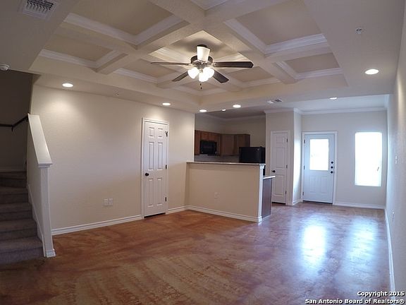 Beautiful 3 bed/2.5 bath four-plex rental that boasts granite countertops, stained concrete floors, tray ceilings, 1 car garage, pre-plumbed for water softener if desired, washer and dryer connections, and a private back yard with a privacy fence, covered back patio. All bedrooms are upstairs. No neighbors behind the property. Carpet just replaced. Judson School District. MUST SEE!! No cats or snakes