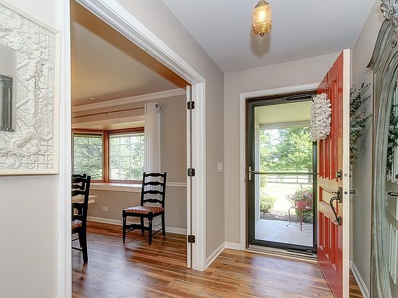 Lovely, 5 acre equestrian property is on the market for the first time in 35+ years, and it is exquisite! Many updates and improvements you will just love! The three bedroom 2.5 bath, solidly built ranch offers you so much! Luxury vinyl plank flooring throughout the main level is just beautiful and maintenance free! Lovely, expansive, country kitchen is the heart of the home. Granite counters, wood cabinetry, tile backsplash, expansive buffet area with open shelving above is the perfect place to place your family-style meals. Generous sized walk-in pantry with loads of storage as well as a beverage refrigerator. A large bay window floods the kitchen in natural light and allows you to look out over the beautiful back yard as you prepare your meals. The family room is so comfortable and inviting! White beamed ceiling, 2 skylights, real wood shiplap, over sized windows and a masonry fireplace all add to the inviting feel of this gracious room. When you have family or friends over for meals the dining room can accommodate everyone. A large bay window overlooks the front yard and farm fields across the road. Double French doors open to the foyer. The master bedroom is very spacious with its own triple pane patio door which opens to the backyard. The master bath has been updated and has an oversized tub for soaking the day's work away. The 2nd and 3rd bedrooms are both nice size. The hall bath has been updated, with double sink vanity, skylight and tub/shower combo. A main level laundry/mud room is quite spacious with hooks for coats, cabinets for storage and a super cute powder room at the end of the hall. Do you need more? You got it! The full basement has been completely finished and offers you a cabin/western themed decor complete with a barn wood wet bar, masonry fireplace, open ceiling with fun lighting and a pool table where you and your guests can have loads of fun. A spacious storage room, plus several double closets cover all your storage needs. Now we turn to the outdoors! A large patio with retractable sun awning is perfect for cookouts and more. Weather just a little bit off? No worries. Move your outdoor meal to the screened porch where a large picnic table lets you enjoy your meal no matter what the weather, as you overlook the back yard and your horses grazing peacefully in their pastures. The backyard is fenced for pets and features a cute as a button chicken coop for your future laying hens and farm fresh eggs. For the equestrian, the 5 stall horse barn is a dream come true. 5 matted stalls, 1 stall large enough for use as a foaling stall. The large tack/feed room with countertop, bar refrigerator and wall cabinets and under the counter drawers for all your storage needs will cover all your horsey belongings. An indoor arena with kick boards and new sand footing is all set to go. The dirt lot features a three sided loafing shed with electric for placing fans for your horses during the summer months. Two grass pastures and an outdoor riding arena is an added plus. The property backs to woods with no neighbors behind. A portion of the acreage is wooded and is visited frequently with all types of wildlife. This dream property is located mere minutes to I90, for easy commuting to both the Schaumburg and Rockford areas. 10 minutes to Huntley shopping and restaurants. 20 minutes to the Randall Road corridor for all its shopping and dining options. Charming downtown Hampshire is 8 minutes away for small town restaurants and Chick-n-Dip ice cream! This is a lifestyle you have been dreaming of...don't wait another minute, see it tomorrow and make it your own!