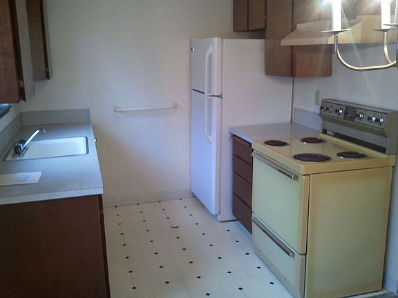 2 bedrooms, 1 bath, with living room, dining room adjacent, and kitchen. Porch and backyard (common), in-unit washer/dryer hook up room. 1 designated parking space, and others for visitors (shared spaces). Swimming pool (open in winter). Ground floor with one floor above unit. Quiet, safe, wooded.Rent includes water/sewer and garbage