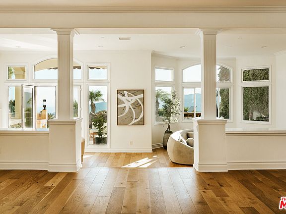 Experience serenity and sweeping views within the prestigious guard-gated Summit Enclave in the Highlands of Pacific Palisades. Set on a coveted front-row position along Calle De Sarah, this exceptional estate offers unobstructed ocean and mountain vistas, along with the picturesque terracotta rooftops of The Summit neighborhood below. Beautifully updated where it matters most, this Palisades retreat combines an open-concept design with defined, inviting living spaces. The gracious foyer flows seamlessly into a well-appointed kitchen, an oversized family room, and an impressive great room with remarkable scale and volume. Abundant natural light fills the home throughout the day, enhanced by oversized windows and French doors that create a sense of openness and connection to the outdoors. A secluded en-suite bedroom on the main level provides flexibility for guests or family use. Upstairs, a wide staircase leads to a comfortable landing connecting three spacious en-suites, each offering exceptional light and privacy. The expansive primary suite is a true sanctuary, featuring a cozy fireplace, generous sitting area, large walk-in closet, bright spa-like bathroom, and a private balcony the perfect spot to take in breathtaking sunsets over the hills. A spacious and tranquil office provides the ideal environment for work or creativity; stunning wood detailing, custom built-ins, and abundant natural light make this room as functional as it is beautiful a refined space that blends comfort and focus. The outdoor spaces are equally impressive, ideal for both relaxation and entertaining. Enjoy a covered patio, built-in BBQ kitchen, pool, jacuzzi, lush lawn, mature landscaping, and an elevated sun deck for lounging. Residents also enjoy access to The Summit Club's world-class amenities, including a resort-style lap pool and spa, tennis and pickleball courts, fitness center, basketball court, children's playground, and expansive grassy park. A nearby private dog park with an additional play area completes this exceptional offering. With its magical setting and wealth of luxury amenities, this home truly defines extraordinary coastal living in Pacific Palisades.