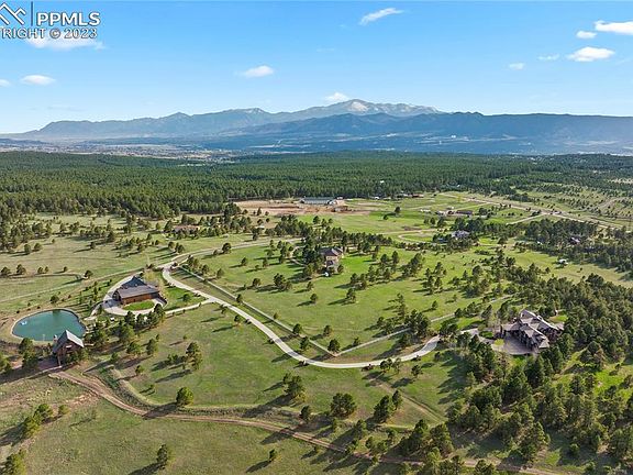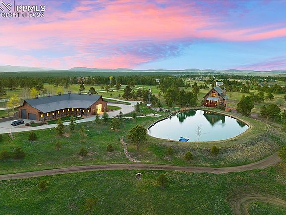 Rare and unique high-value investment property available for a perspicacious buyer seeking privacy and tranquility on a 28+ acre property perfectly suited to enjoy the best Colorado has to offer in close proximity to Denver and Colo. Springs. Meticulously curated architectural masterpiece with both the primary residence and guest house evoking the feel and coziness of an Aspen lodge and luxury resort. Design and custom build took over three years to complete in 2008, and includes: 5,810 SF. heated RV/car barn, 1,800 SF. A-frame guest house, ~.5 acre fish pond, ~1 mile ATV/MX track, old farm windmill, and substantial hardscape to construct a dream property for family and friends to enjoy! The primary residence features a well-lighted grand timber and stone porte cochère for guests and upon entering the home your eyes are immediately drawn to exquisite open space showcasing hand-crafted timber trusses, stunning architectural lines, stone pillars, grand fireplace, hickory hardwood floors, and walls of glass with timber and pastural views and Pikes Peak as well. Gourmet kitchen w/ high end finishes. Main level luxurious primary suite w/fireplace, two decks, massive closet, soaking tub, and steam shower w/ curved glass. The main level shares 2,500 sq ft of outdoor entertainment space. The home has a total of 10 decks/patios. 6 en-suite bedrooms. Exercise room w/ dry sauna and 2 laundry rooms. The guest home features elaborate woodwork and high end finishes similar to the main home, with a high ceiling loft en-suite bedroom, oversized fireplace on the main floor with porch facing the fish pond, walk-in gun room safe on the lower level. The RV/car barn is heated with epoxy floors, a bathroom, and multiple oversized doors for full RV access. Property management equipment is included w/ full price offer. Zoned for horses. High speed fiber optic cable is on site and so much more. Visit our marketing video at our dedicated home webpage for additional info and photos.