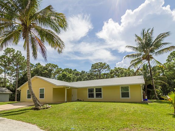 JUPITER FARMS NO HOA! NO RESTRICTIONS! Bring your family, pets and all the toys! This beauty offers 4 bedroom, 2 bath, den/siting area, split floor plan, large spacious kitchen with exquisite cabinetry and wine cooler, entire house reverse osmosis system,24 x 18 bonus room with pool table and movie theater set up(which stays) impact windows and roof in 2015 and a 41 x 26 CBS detached 4 car garage/workshop built in 2008 that has a safe room. All this sits on a 2.5 acre dry lot.