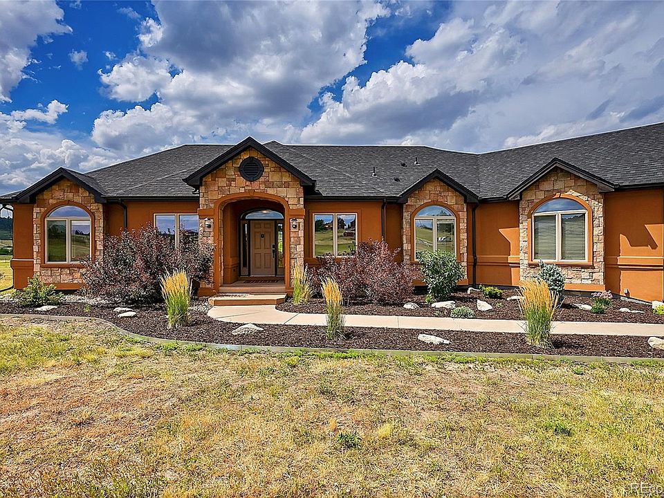 Location and views!!! Easy access located on the North side of Castlewood Canyon State Park in Franktown only minutes to Castle Rock, Parker & Elizabeth. Beautiful custom home on over 10 acres. Experience a quiet country lifestyle close to amenities. You will enjoy main floor living consisting of 3 bedrooms, 3 baths, an open concept living room, dining room, kitchen, office, and laundry with incredible views from every room. The light and bright lower level has high ceilings, 2 additional bedrooms, 3/4 bath, a family room, and a partial kitchen (no stove). The rear of the home features a beautiful patio where you can enjoy awe-inspiring views and sunsets. You can add facilities for horses, animals, workshop, or whatever your heart desires. This property is a rare find. Schedule your showing soon.
