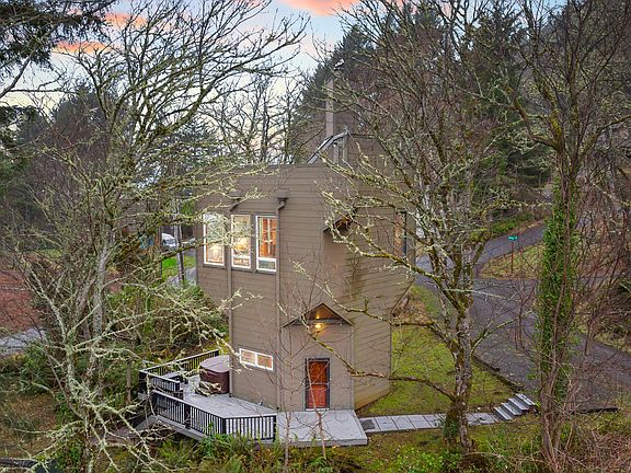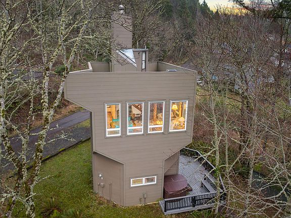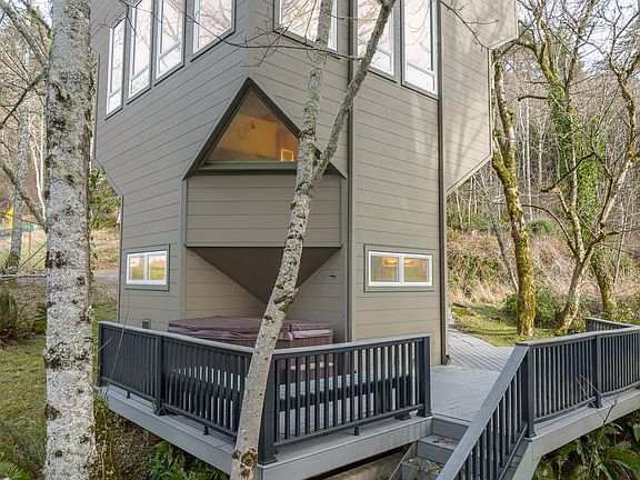 Architecturally Stunning Home in the Heart of Oceanside! Offering ocean views perched up in the trees, 3 levels + rooftop deck, this home is arguably the most unique home in Oceanside. Solidly built with a huge beam soaring up through the center of home with warm wood interiors & angled windows. A stone surround fireplace anchors the upper living area, where the coffee table becomes a work of art centered around the beam. Remodeled kitchen features quartz counters, wood cabinets and SS appliances. NEW in 2018: fiber cement siding, windows, paint, kitchen/ bathrooms remodel and trex deck w/ hot tub (2016). Spacious rooftop deck offers extra space to enjoy the view and entertain. Flat yard on corner lot just a few blocks to the beach and restaurants.