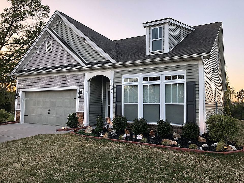 Best lot in Timberlake! No houses around or behind! 3 bedrooms, 2 baths on main, bonus + 1 bedroom, 1 bath upstairs. Covered 9x14 patio with extended 12x14 patio in back, perfect for entertaining! 10 ft ceilings throughout with crown molding. Hardwood floors throughout downstairs. So much to offer plus Clover Schools!