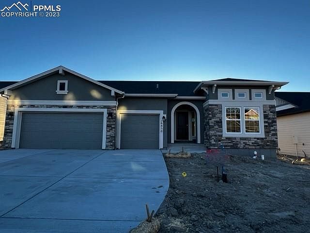 Ready in December. Paradise ranch plan with 3 car garage in Jackson Creek North. 4 bedroom, formal dining, 3 bath home. Designer kitchen layout with charcoal stained maple cabinets, Quartz countertops, walk-in pantry, stainless steel appliances including gas cooktop and refrigerator. Large main level master bedroom and bath. Master bath has expanded shower with seat, double sinks and walk-in closet. Great room has fireplace and looks out onto large partially covered patio perfect for enjoying Colorado rain or shine. Main level also features breakfast nook and formal dining room. Finished basement includes 1ft. taller ceilings, large rec room, 2 bedrooms, 1 bathroom. The downstairs offers a large unfinished storage space which could be finished at a later date for an additional bedroom. Home also has air conditioning, smart home package, radon mitigation system. Interior color selections of the Design Pak Vibrant-1 is a bright and lively interior that incorporates shades of white, gray, blue, and hickory accentuated by chrome and black fixtures and hardware.