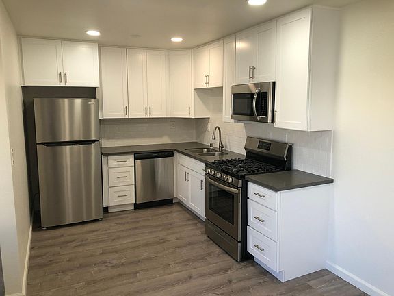 Totally refurbished - all new cabinets, new quartz counter tops, brand new stainless steel appliances including refrigerator with ice maker, all new wood plank flooring through out, new paint, and new blinds. One car enclosed garage included plus additional driveway parking space. Upstairs unit with private balcony. Owner pays water and trash, tenat pays own electrical and gas. No pets. Quiet building.