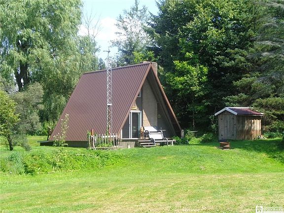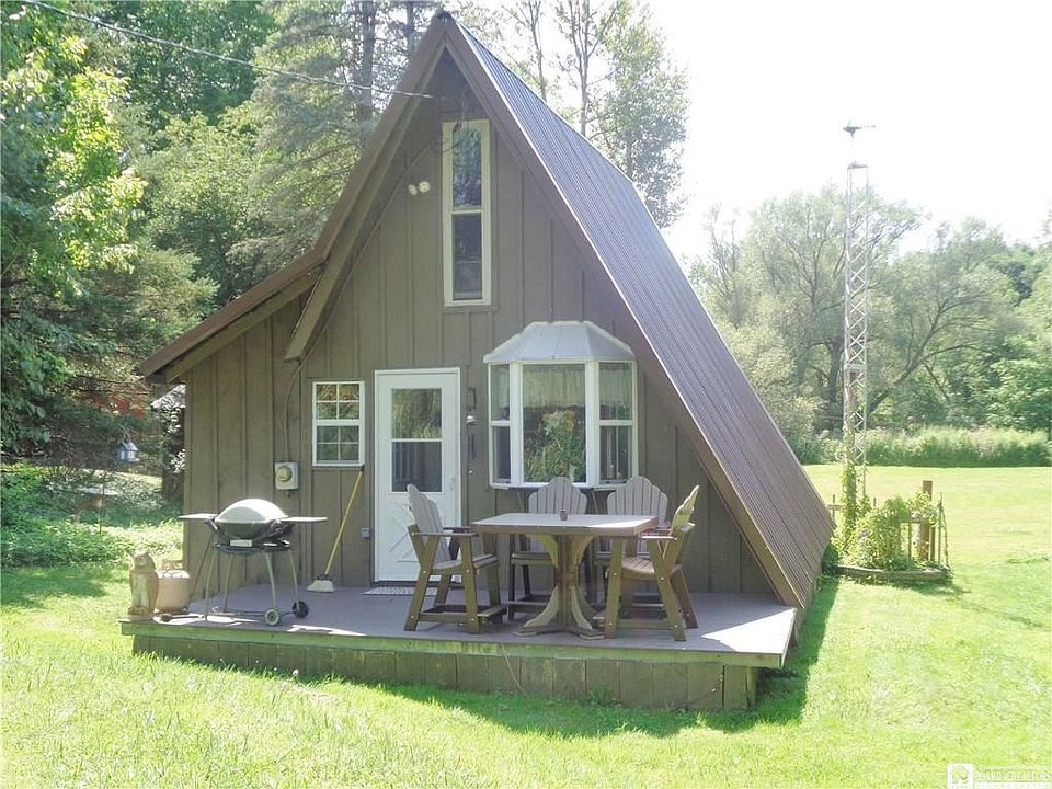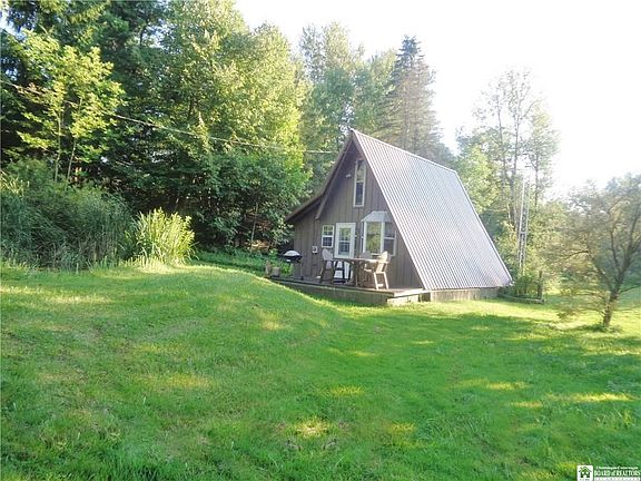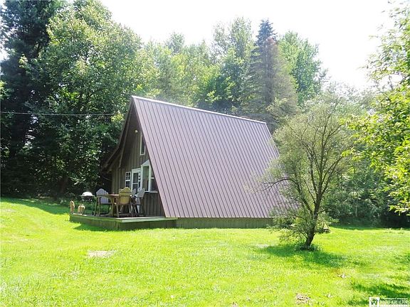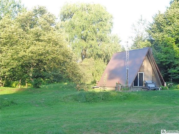 Ever want a secluded A-Frame camping or hunting cabin With a flowing creek with trout With a stocked pond We have it here! Located in the heart of Chautauqua County, 20 minute drive to amenities! Tucked away just a few miles from State Land. Great family retreat spot, recreational fun, hunting or camping. A-Frame has a living room, kitchenette, full bathroom and a spiral staircase leads to a loft that fits 3 single beds. New steel roof put on 5 years ago. Water well drilled 6 years ago by Ehmke Well Drillers. New vinyl windows & doors. Outhouse in the woods with running water that drains into a holding tank. 4 sheds to hold all your supplies, gear, toys, etc.!! Electric circuit breakers with 220 line, fiberglass insulation. Front & rear decks, maple kitchen cupboards, brick fireplace, tongue-in-groove pine walls & ceilings. Close to snowmobile trails. Make memories here...this cute cabin sits back in the trees so you can't see it from the road. Once you get back in there is a large cleared area, picnic grove, tree swing, dog run and trails cut through the woods, great for walking, 4-wheeling. The bubbling brook with fish is right out of a nature magazine!-Seasonal cabin--