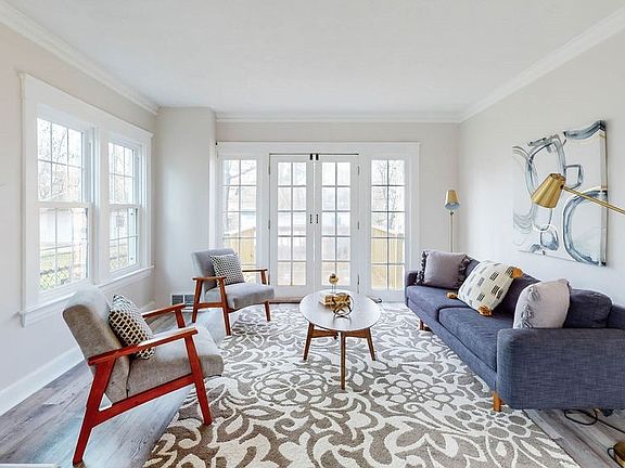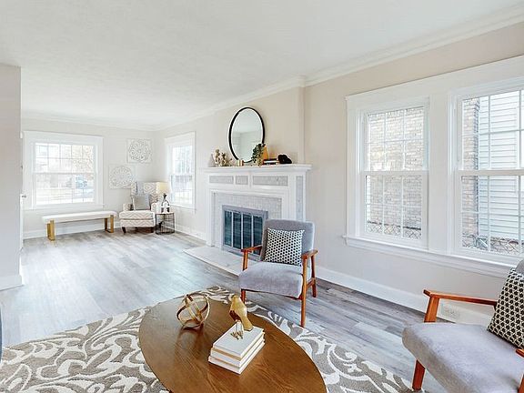The front porch sets a welcoming tone and invites you inside to a gracious foyer that flows seamlessly into the formal dining room and new kitchen. The oversized, light-filled living room features a wood-burning fireplace and French doors that open to a newly constructed deck overlooking the private backyard—ideal for entertaining or relaxing at home.
