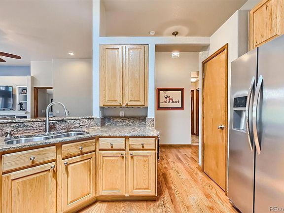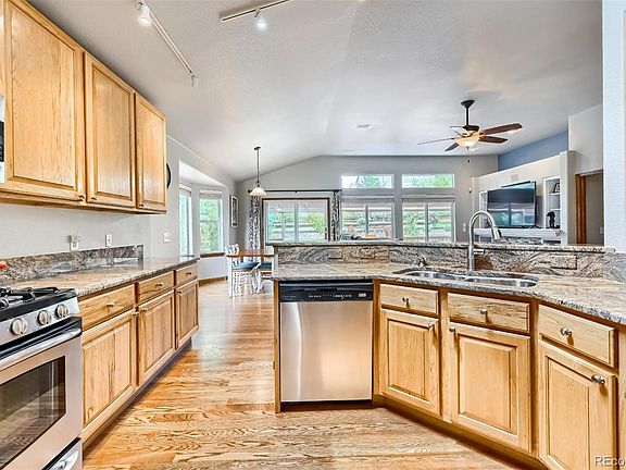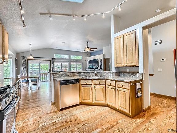 One of the most popular ranch floor plans located in the Red Hawk Golf Community. This wonderfully updated 4 Bedroom, 3 Bath home is situated backing to a walking trail. As you enter the home, hardwood floors will greet you all the way through to the living room. The beautiful kitchen features slab granite countertops, hickory cabinets, stainless steel appliances, hardwood floors and breakfast bar. The living room opens up to the kitchen and has a gas fireplace and access to the back deck. The main level primary bedroom with has a vaulted ceiling, large walk-in closet and access to the back deck. The spa-like remodeled primary bath has a huge walk-in shower, custom cabinetry, dual sinks with a granite vanity top. Enjoy relaxing and entertaining on your oversized deck that has a pergola cover for those hot summer days. Main level laundry/mud room with storage cabinets and utility sink. The finished basement has a family room for games, a built-in office area, wine cellar with wine fridge and wet bar. There are 2 additional bedrooms, an updated bathroom with a shower and a storage area. The 3-car garage has plenty of space. Wheelchair accessible. New roof in 2019 and east facing driving means less snow shoveling. Lower tax rate than other nearby neighborhoods. Multiple access points to I-25 and close to downtown Castle Rock, The MAC (Phillip S Miller Park), The Promenade restaurants & shops. Don't miss this one!