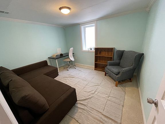 Office bedroom: Desk & office chair, pull-out couch, bookcase, reading chair, bright egress window