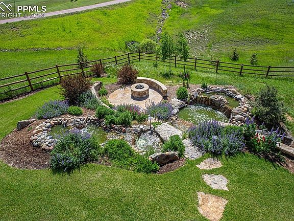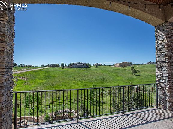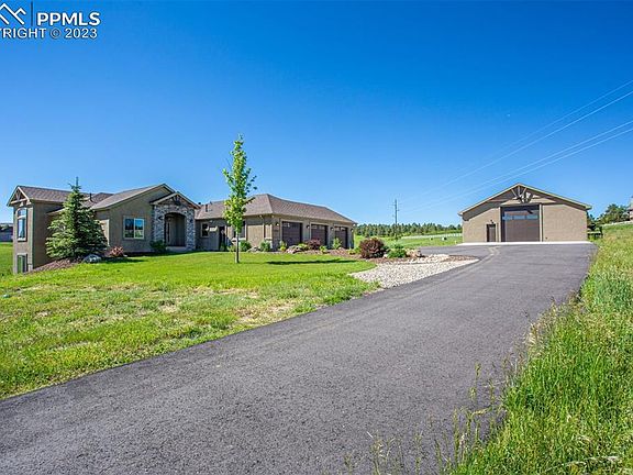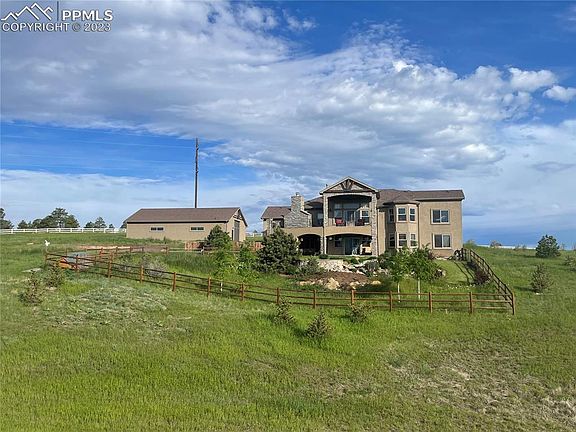 Lovely attention to detail set on 5 acres in the coveted Cherry Creek Crossing neighborhood. 4 bed/ 4 bath with gourmet kitchen, formal dining area, breakfast nook, beautiful hand planed hickory floors, stamped concrete decks, wood burning deck fireplace, and panoramic views. Main floor living room has gas fireplace, vaulted ceilings, and beam work. There is an office, and main bedroom w 2nd interior fireplace on the main floor. Walk out level has a wet bar, great gaming area, 3d fireplace, and second en suite bedroom. 3 car attached garage in front, and a second attached garage work shop fits another 4 cars, but then you have the finished drive through Outbuilding that can park a large RV, and still hold all of the other toys. The Outbuilding has a bathroom w/ shower, and too many features to list here. The workshop downstairs through the utility room can be the second man cave. Extra attention to landscaping including koi pond w multiple water falls, gas firepit, and seating. This is a rare horse property. Over 4000 sq ft. with plenty of sunshine, decks and areas to hang out on! This is an EASY commute to Denver and has High Speed Internet. Close to Fox Run Regional Park, hiking trails, and everything Colorado has to offer. Less than 5 miles to I25/ Monument.