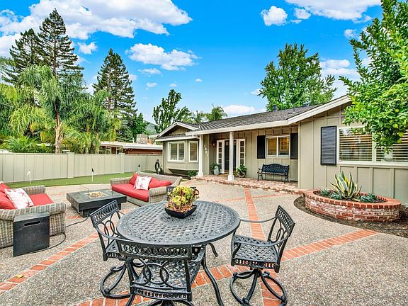 Welcome to this custom single-story home on the 16th fairway of the exclusive Green Valley Country Club. This elegant residence features three spacious bedrooms including 2 primary suites, three full bathrooms, and a dedicated office space. Main primary suite features new custom closet and updated walk in shower with premium fixtures. The home boasts plantation shutters, and a beautifully remodeled gourmet kitchen with island and pantry. Enjoy cozy evenings by the gas fireplace and the charm of hardwood floors throughout. Additional highlights include an a newly installed sprinkler and drip system, French drains and raised garden beds for the green thumb. Plus, you'll love the private gated front courtyard with mini putting green, perfect for relaxing and entertaining. The backyard is designed for hosting friends and family with a covered kitchen area, pergola style gazebo, Plunge XL sauna that seats 7 and golf cart access to the club. This hidden gem is located near renowned wineries, delicious dining options and scenic Rockville Hills Park.