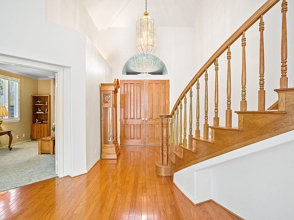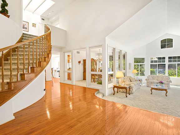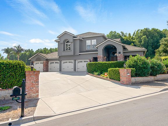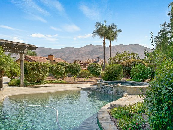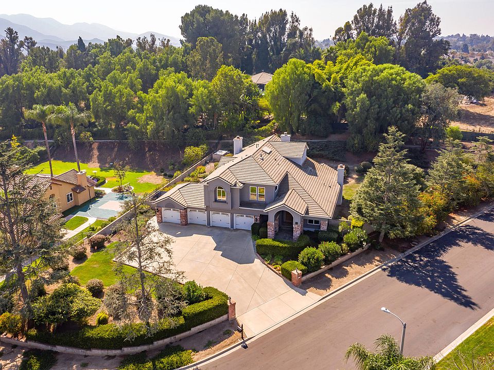 Don't miss this rare offering of the coveted Braemar Plan One with oversized four-car garage! This 5 bedroom/4.5 bath pool home on approx. 1/2-acre sits on a corner lot of a cul-de-sac with unrivaled privacy. High ceilings and picture windows illuminate a wonderful floor plan for everyday living and entertaining! Spacious interior on approx. 3,700 SF boasts formal living room and family room with inviting fireplaces, formal dining room with glass window walls and updated chef's kitchen with center island, stainless steel appliances and nook. Ideal for today's needs, this home also features a downstairs bedroom or home office plus one and a half baths. Upstairs, unwind in the elegant master featuring volume ceilings, fireplace and en suite bath with separate vanities, stall shower with frameless doors, soaking tub and walk-in closet. Three additional well-appointed guest bedrooms for study, sleep and storage include Jack 'n Jill and en suite baths. From al fresco dinners to sunset cocktails, enjoy the private backyard with shaded and open patios surrounded by spectacular mountain views and lush trees. Entertain in the beach entry pool with spa and waterfall, grassy yard with fruit trees and flowering blooms. Additional amenities include security alarm system, plantation shutters, silent master central vac, insulated garage doors and dual zone A/C. Truly a perfect blend of gracious elegance and comfort, make this hidden gem yours!