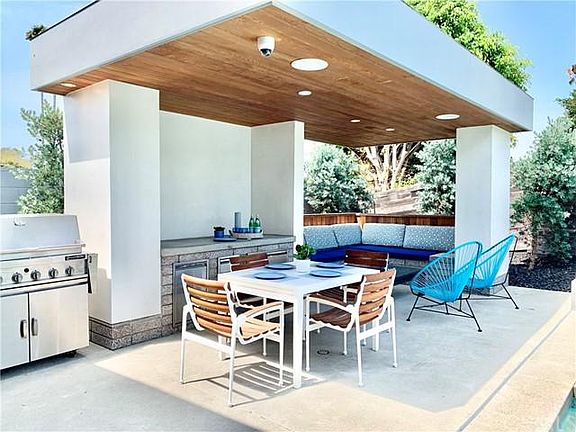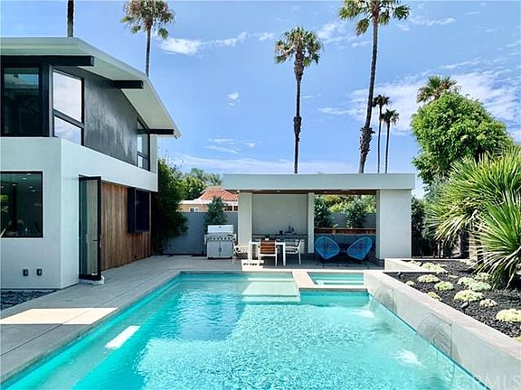 Sitting steps away from Davenport Beach Park and the waterways of Huntington Harbor is this sublime modern residence, a 1964 home remodeled from the ground up by award winning architecture firm Assembledge+. Featured in the book The California Style, Architecture on the Edge in Paradise, this masterful renovation honors the midcentury bones of the structure while infusing the residence with modern design that enhances the indoor/outdoor flow and natural light. Large sliding glass doors that stretch from wall-to-wall at both the front and the back of the home create an effortless continuation between two outdoor seating areas and the indoor living room, notes writer Emily Engle in a feature for Design Milk. The outdoor spaces reflect the quality of the interior and include a swimming pool and spa, a covered lounge and dining area, and designer landscaping. This is a complete and move-in ready property of exceptional quality, presenting an optimal design and configuration for enjoyment of the Southern California climate and lifestyle.
