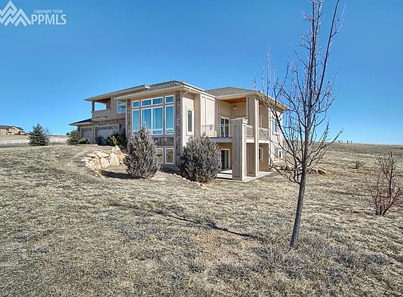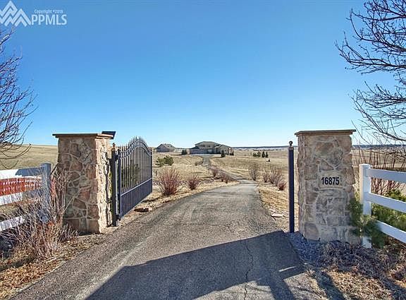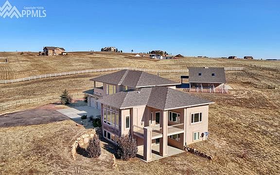 Gorgeous horse property with stunning Pikes Peak views! Privacy awaits you and your horses on this quiet 5-acre gated estate on a cul-de-sac with 4600 square foot custom 5/4/3 home with open concept living and beautiful custom show barn, stunning stone columns, white vinyl fencing, and automatic entrance gate. Main floor done with warm hickory hardwood flooring has large kitchen with large island, breakfast bar and prep sink, huge pantry, beautiful dining room with coffered ceiling, and covered patio with views. Main level also has spectacular living room with gas fireplace and floor-to-ceiling windows that gaze out at Pikes Peak, warm and inviting office with French doors, and grand foyer with curved staircase. Upstairs hosts more beautiful views from the spacious master suite with huge 5-piece bath including rain shower and soaking tub, private balcony and large closet. 2 more spacious bedrooms and a bathroom complete the upstairs. Walkout basement features a wet bar, cozy and bright family room with gas fireplace along with 2 more bedrooms with large closets, a bathroom, covered patio, and fabulous theater room with 100 inch screen and surround sound installed. Outdoors you will enjoy a custom 36 x 36 barn with covered patios, hayloft, and large tack room. Barn has electrical and plumbing, is pre-plumbed for electric automatic waterers and boasts 3 Priefert stalls with dutch doors & stall mats, three 12 x 30 steel paddocks attached to stalls, 12 x 36 drive-through concrete aisle with drain, in addition to huge loft, extra storage, & concrete aprons on 3 sides. For the horses, nice fenced pasture to turn out for grazing. Neighborhood has a riding easement that circles the entire perimeter of the subdivision.