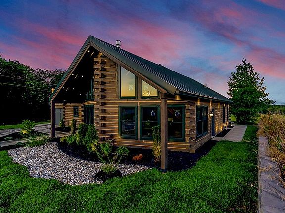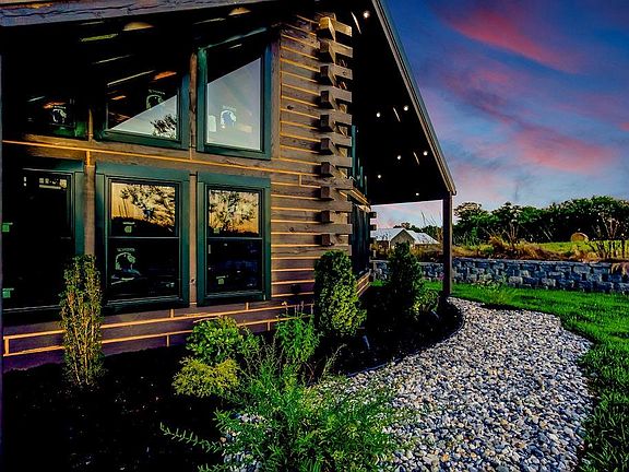 Nestled on 10 picturesque acres near Wallace State Park, this stunning custom-built true oak log cabin blends rustic charm with modern luxury. The land offers a mix of woods and pasture, a stocked catfish pond, and two deer stands—perfect for outdoor enthusiasts. A grand entrance with illuminated stone pillars leads to a long concrete driveway, ending in a circular front approach with a striking 20’ birch tree. Oriented to the east, the home provides shaded summer evenings on the expansive stamped patio with illuminated pavers and a hot tub hookup. The upper deck overlooks a large, level backyard framed by towering 25’ privacy evergreens. Two 30’x60’ outbuildings with concrete floors offer endless possibilities—one includes its own septic system, bathroom, and a 1.5-story layout suitable for an apartment. Both are propane-stubbed for heat and have surrounding concrete sidewalks. Timed exterior lighting highlights the home and landscape at dusk. Inside, an oversized front door opens to soaring 18’ vaulted ceilings, exposed beams, a floor-to-ceiling stone fireplace, and a wall of high-end angular Pella windows. Hardwood floors flow through the open-concept living area into the gourmet kitchen, featuring custom granite-topped cabinetry, KitchenAid appliances, and a massive island perfect for hosting. The main-level primary suite is a retreat with a dual-head steam shower, six body jets, and an on-demand hot water and filtration system with dual 75-gallon water heaters. USB-equipped outlets add modern convenience. Upstairs, three spacious bedrooms offer thoughtful layouts—one with a private en-suite bath, while the other two share a Jack-and-Jill bath with an oversized Jacuzzi tub. A fourth bedroom includes an office nook. From the upper balcony, admire the hand-crafted antler chandelier, a stunning centerpiece to this remarkable home.