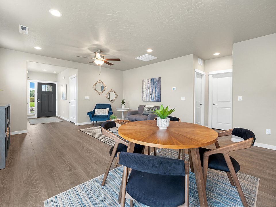Live near the community park with a fully fenced south facing backyard to enjoy the sunshine! The Canyon townhome offers great comfort in a modestly sized single level plan. The living room adjoins the dining room, and the efficiently-planned kitchen boasts ample counter space and cupboard storage. The main suite features a dual vanity bathroom and a generous closet. The other two bedrooms boast large closets and share the second bathroom. It's no surprise this home is as popular as ever. This home only shares a garage wall, all living walls are detached. Photos of a similar home and not indicative of included features.