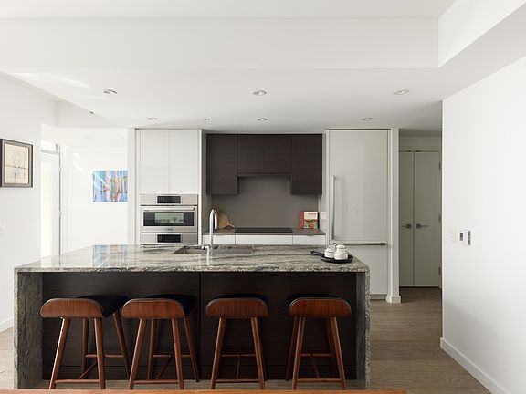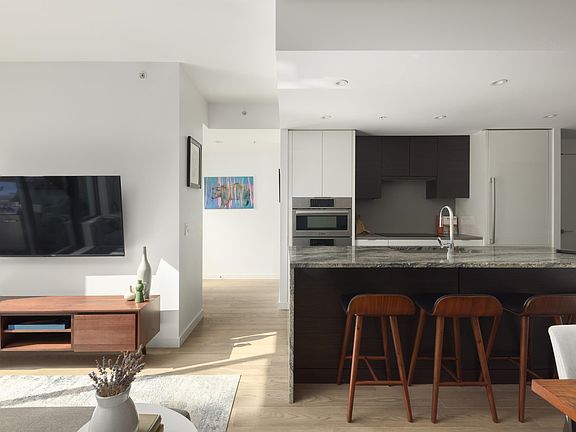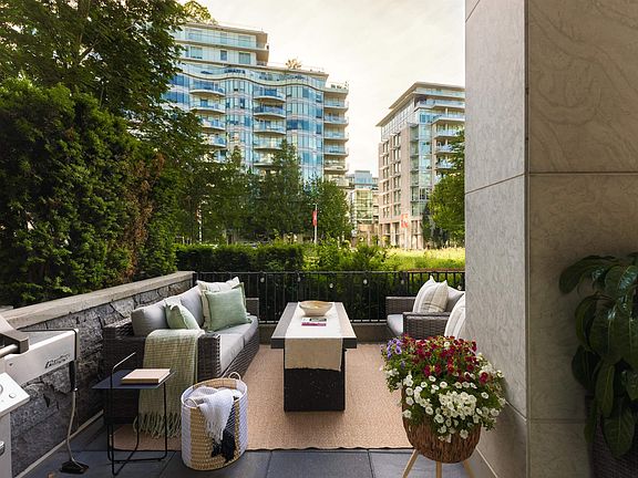 Navio at the Creek – a beautifully crafted townhome by Concert Properties, ideally located on the quiet, west-facing side of the building, overlooking East Park. This vibrant 3-acre green space links directly to the seawall, offering a peaceful, natural setting for daily living. This 2 bed + den home boasts over 320 sqft of private patio—perfect for entertaining or soaking up the sun. The chef’s kitchen features Bosch appliances and a waterfall island. The generous primary includes an ensuite with soaker tub and separate shower. Includes A/C, over-height ceilings, and custom California Closets throughout. Enjoy concierge, fitness centre, resident lounges, and an urban garden terrace. Steps to the water, dining, and all Olympic Village amenities.