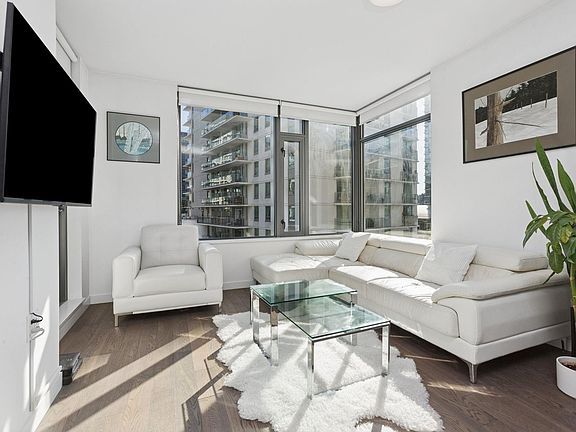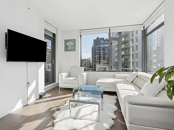 Experience waterfront living at its finest in the exclusive Navio building by Concert Properties. Built in 2018 and ideally located beside the upcoming 2.7-acre “West Park,” this elegant east facing 1 bed + den (approx. 50 sf) end unit lives larger than its footprint, sharing only one wall and framed by expansive windows that bathe the interior in natural light. Features include Bosch appliances, air conditioning, EV parking, and a private balcony overlooking the tranquil courtyard. Enjoy serenity away from street noise while being steps to the Seawall, SkyTrain, boutiques, cafés, and world-class dining. Resort-style amenities include concierge, fitness centre, rooftop terrace, lounge, visitor parking, and secure bike lockers—the perfect blend of urban luxury and waterfront calm.