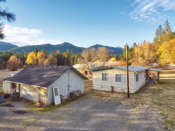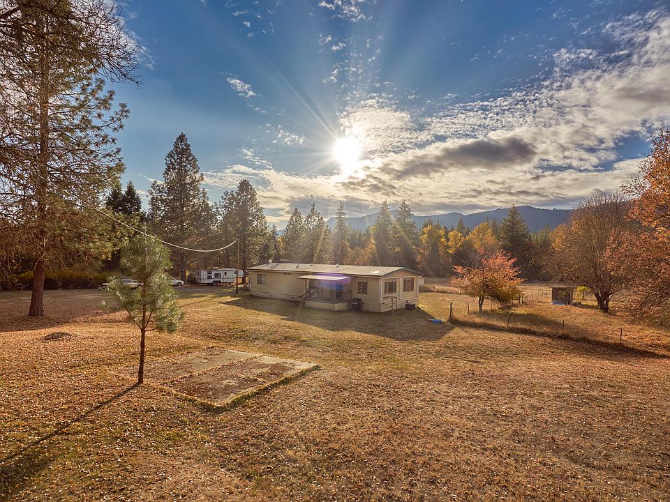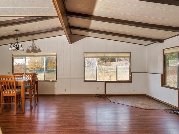 A beautiful location with endless possibilities on over 5 acres. This 3 bedroom 2 bathroom home has a large living room with vaulted ceiling. The kitchen has lots of cabinets and counter-top space with a large island and eating bar. The bathroom and laundry room have tile floors. Enjoy the enclosed patio that looks out to the back of the property with picturesque views of the surrounding mountains. Property backs up to Pleasant Creek. There is a detached garage with a finished office. This property is fully fenced and there is horse barn and a Chicken house.