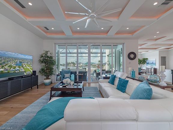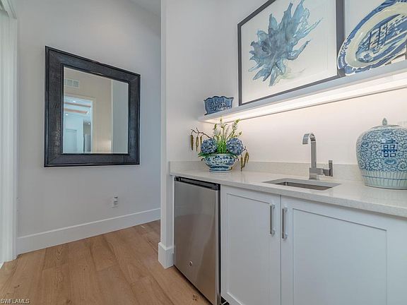 This immaculate, professionally-designed 2-story home with a private dock and patio invites comfort, and exudes modern elegance. With 4 bedrooms, 4 full bathrooms and 2 half baths, generous living space and stylish finishes, you'll enjoy a perfect setting for relaxing and entertaining. Enjoy entertaining in the generously-sized living/dining area, wine fridge, huge windows and impact glass sliding doors that lead out to the pool deck. The recently built dock with 15,000 boat lift and 2 jet ski lifts has plenty of room for evening sunset views. The first-floor master suite offers an en-suite tile bath with a stand alone tub and shower. The upstairs master bedroom has its own private bath plus a huge walk-in closet with sliding doors, with a shelving system and drawers. Plenty of room to entertain throughout the house. Close to open water for the avid fisherman.