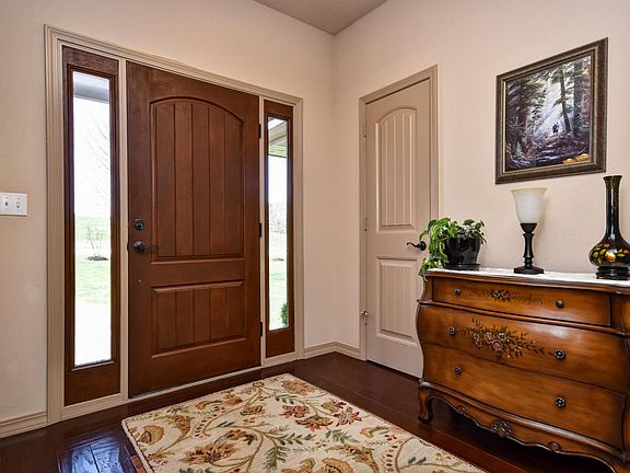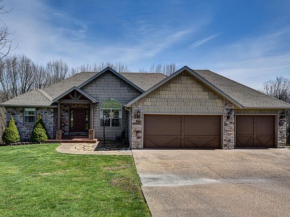 Prepare to be impressed! In Nixa School District, this stone and steel-siding house offers ample square footage and is on 3 acres with a 32x40ft shop perfect for RV and/or boat storage (one door 14ft high, other 12ft high, both 12ft wide). Land includes a woodsy picturesque view that backs up to a fence for pets. Features include a chef's kitchen with a granite-topped center island, formal and informal dining spaces, Jack and Jill sinks in the master, hickory cabinets throughout, large closets, ample storage space, and custom landscaping. The walkout lower level has a door at the top of the stairs for extra privacy, and walks out onto a patio with a firepit, dusk-til-dawn auto patio lights and prewired for a hot tub--perfect for entertaining!