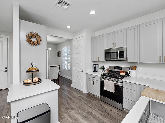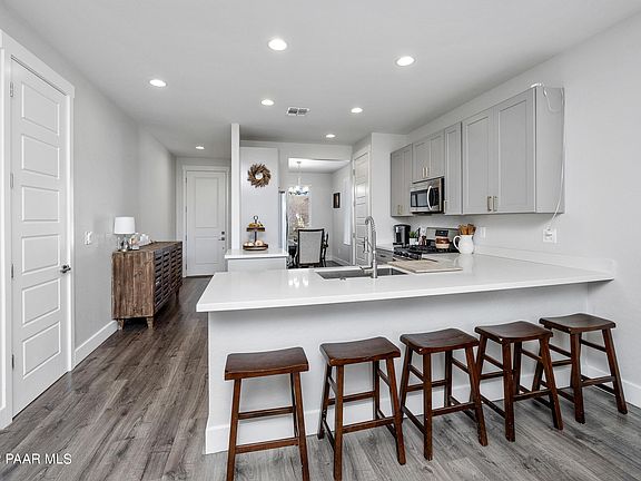 Of nearly new construction and with a beautifully landscaped front and rear, this Chino Valley home on a premium lot has outstanding curb appeal and great mountain views! Outlast + Waterproof wood laminate flooring throughout the living area and bedrooms plus tile in the bathrooms, recessed LED lighting throughout, raised panel 8' shaker style interior doors, low E double pane vinyl windows, 9'+ interior ceiling height. 2x6 construction with full sheer construction, low maintenance synthetic stucco and insulated interior sound walls for quieter, more private living. Lots of storage, including entry coat closet and additional closet. Great open kitchen concept with 42 inch upper cabinetry and soft-close solid-core doors and drawers with full extension glides and handy pantry. The stainless