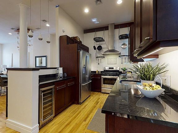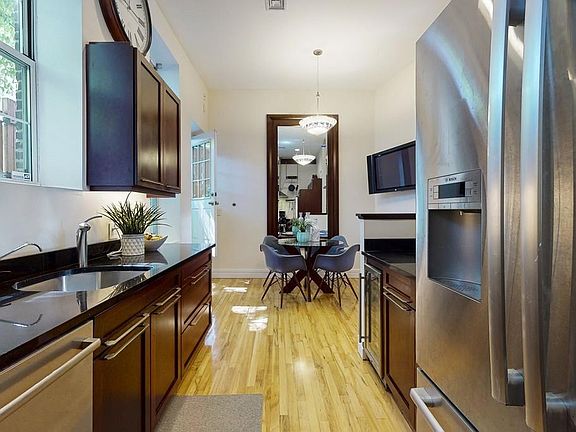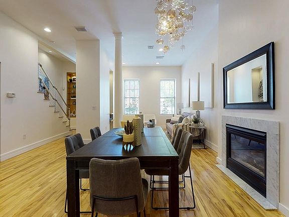Come see this unique, one-of-a-kind, 4 bedroom, 2 full and, 2 half baths, single-family, brick row house in South Boston. This home combines its history in the former coffee, tea and spice district of South Boston with perfect location on the edge of South Boston's Seaport and within blocks of the Broadway T station. Large, wooden entry doors, with equally grand wood and glass foyer doors welcome you into the first floor featuring a gorgeous hand-blown, glass bobble chandelier in the large living room, above the gas fireplace. Gleaming hardwood floors are on all levels of the home. The second floor features the master bedroom and en suite bath, two additional bedrooms, a bath and an open office area. The third floor has another master bedroom or a possible family room. This large room has 2 sets of double glassed doors that open onto a stunning roof deck with amazing views of the city and Seaport. TWO DEEDED GARAGE SPACES (not attached) are included.