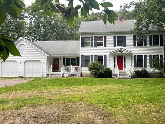 The home has hardwood floors, tile, and carpet, three heat sources including hot water baseboard, a pellet stove, as well as a gas fireplace, a two-car garage with extra storage space above all on a one-acre lot located on a dead-end street and close to the local schools.