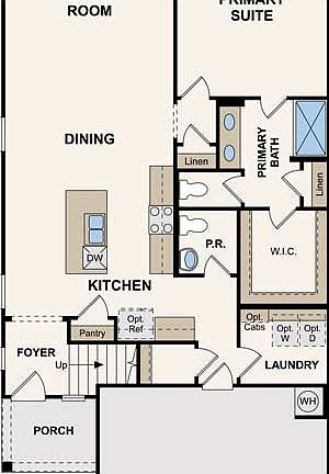 Our popular Whitney plan features a spacious great room that flows openly into the dining area and kitchen, where there's a large center island and pantry. The main floor also showcases the primary suite with a private bath, featuring two sinks at the vanity, a private water closet, walk-in shower, linen closet, and a generous sized walk-in closet. The powder bath, laundry room and extra storage under the stairs are located just off the garage. Upstairs, you'll find a large game room, surrounded by three secondary bedrooms and full hall bath. Options in this home include the second sink in the hall bath upstairs and covered patio.