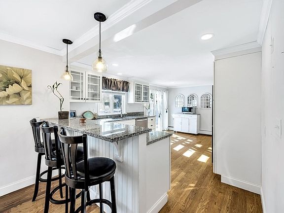 Classic Cape with modern features offering nearly 2,000 sq ft of versatile living space. Enter through the side door into a bright, open den, dining, and kitchen combination designed for easy everyday living. The kitchen features white cabinetry, granite countertops, stainless steel appliances, and a dining area with sliders leading to a spacious wraparound composite deck complete with a pergola and hot tub—perfect for relaxing.The first floor also includes a formal living room highlighted by a whitewashed brick, wood-burning fireplace, along with a convenient first-floor bedroom and a flexible office/laundry room ideal for today’s lifestyle. Upstairs, you’ll find two generously sized front-to-back bedrooms with ample storage and a beautiful hall bath. The finished lower level is ideal for game-day gatherings, hobbies, or additional storage space. No matter your needs, this nearly new, move-in-ready home is waiting for its next owner.All parties to verify the information herein.