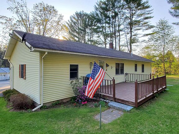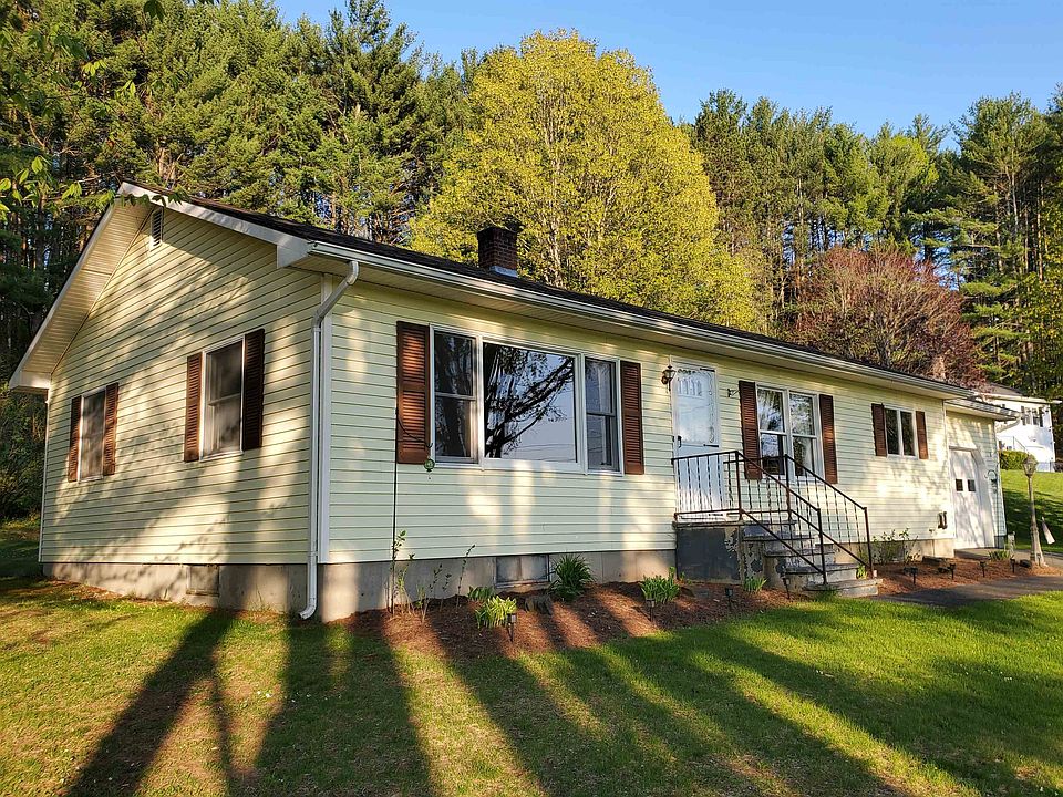 This single story ranch style home, built around 1977, has two bedrooms, one full bath, living room with brick hearth, large L-shaped kitchen with breakfast bar, open to the dining room. There are hardwood floors, carpets in the bedrooms, vinyl in the bathroom and laundry room. There is a full basement, workbench area, baseboard hot water heat, 100 amp circuit breakers. The laundry room provides access to the deck and backyard where there's abundant blueberry bushes, rhubarb, room for your garden, & firepit. The driveway is paved, and drive-in access to the one car garage. This is a neat, clean home in a neighborhood setting, close to town and all amenities. All appliances are included as well as the snow blower, Franklin stove, wooden cabinet in basement. Close to Price Chopper, NVRH, I-91. High School Choice.