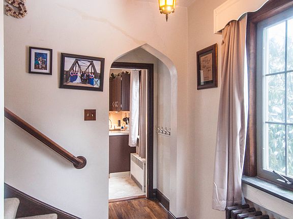 Dauntless is built like a castle instantly instilling fearlessness & determination info ones life. Solid brick construction all around with a slate roof provides a maintenance free construction for years to come. A corner lot with a fenced in flat, green yard for the pets &/or children to safely frolic about while you spectate from your deck. 3 good sized bedrooms enjoy hardwood floors which are throughout the home with a 4th bedroom is in basement. The winter time gathering area is the main living room & is huge with a logburning fireplace ready to chase those winter time blues away.. A special little room off to the side is left for raucous behavior as one would expect from the occupants of a castle.