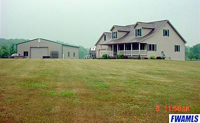 3 bedroom 2 1/2 bath Cape Cod with walkout basement on 10 acres with hundreds of trees planted. 40x56 pole building has concrete floors, water, and heat. Finished area above garage. Above ground pool with deck.