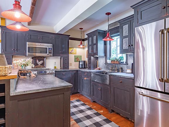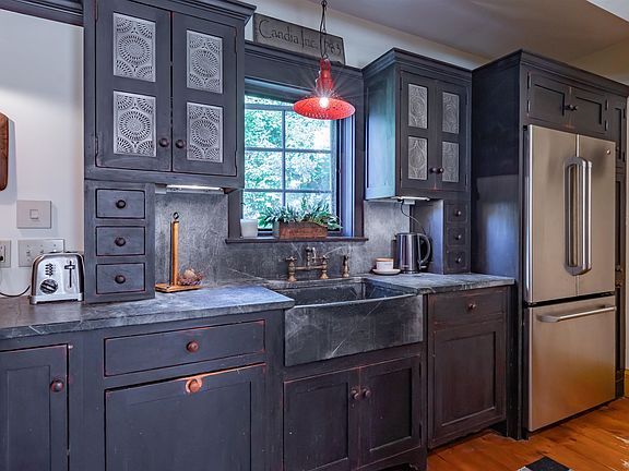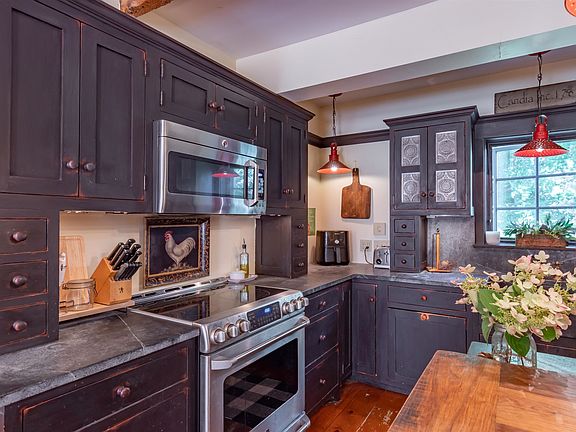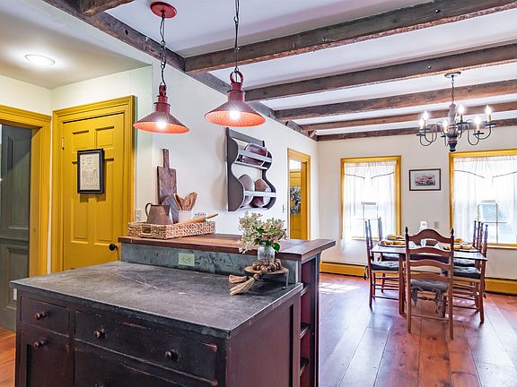 This beautifully preserved circa 1810 country FARMHOUSE offers a unique blend of original features & modern updates. With 4 beds/2 baths, this sprawling home features a flexible floor plan, original woodwork, tastefully painted walls with period colors, custom built-ins, & 3 staircases. The modern kitchen is equipped with custom hand-scraped cabinetry w/1" doors, soapstone counters, & farmers sink, while the formal dining room and sunny living room offer the perfect space for entertaining guests.One of the most impressive features of this home is the original center Bee-Hive fireplace in the kitchen, which was once used for heating & cooking. The primary bedroom is a peaceful retreat, and the other bedrooms are ready to be transformed into a potential in-law suite with a second staircase leading back to the kitchen. The great room is perfect for hosting gatherings, with exposed beams, a wood-burning fireplace, and custom cabinetry. The wide pine floors throughout the house adds to the home's character & charm, while the attached 3-bay heated garage & finished space above offer plenty of additional flex space. The cupola provides a perfect spot for stargazing on warm summer nights, and a 20x20 detached barn features electricity and is ideal for tools ,equipment, or workshop. The property is set back from the road and boasts attractive landscaping, rock walls, perennial gardens, & an inviting patio that is perfect for enjoying a glass of lemonade. Shown by Apt Only