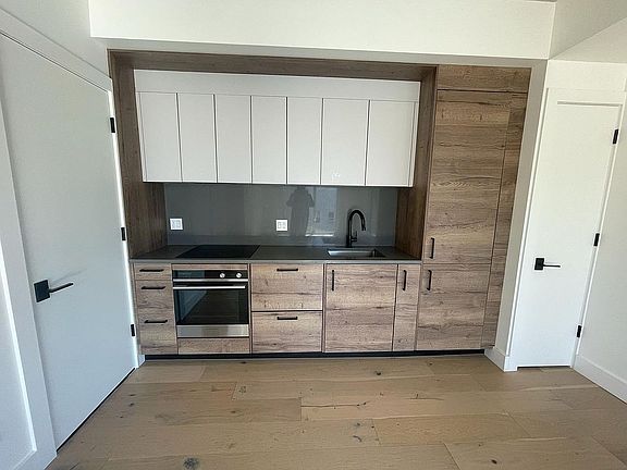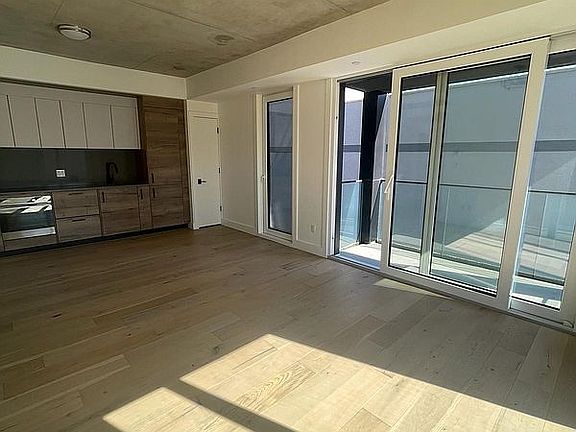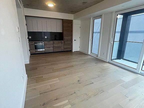 Unit 4A is an ergonomically laid out one bed, one bath residence with oversized German-engineered floor-to-ceiling windows, a 23-foot wide living area, and a private outdoor space. The floors are European white oak wide-plank wood and the ceilings are exposed concrete. The kitchen features custom millwork, plus Fisher Paykel appliances with matching panels for a seamless look. Tile work and fixtures by Porcelanosa. Stain and heat-resistant quartz countertops complete the high-end design.